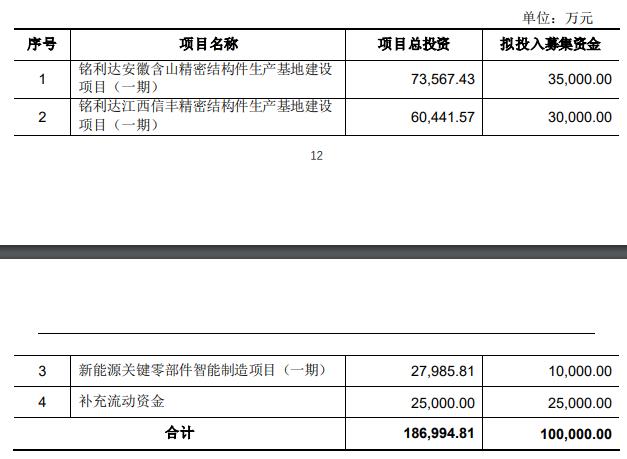 铭利达本次发行新股募集资金总额为11.40亿元,募集资金净额为10.42亿元。该公司最终募集资金净额比原计划多2.61亿元。2022年3月31日,铭利达披露的招股书显示,公司拟募集资金7.81亿元,分别用于轻量化铝镁合金精密结构件及塑胶件智能制造项目、研发中心建设项目、补充流动资金。
