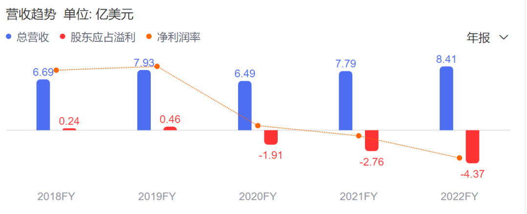 微创医疗是一家创新高端医疗器械的综合集团。2022年,公司营业收入实现8.4亿美元(约57亿元),同比增长15.6%;年内亏损有所放大,达到5.85亿美元(约40亿元)。