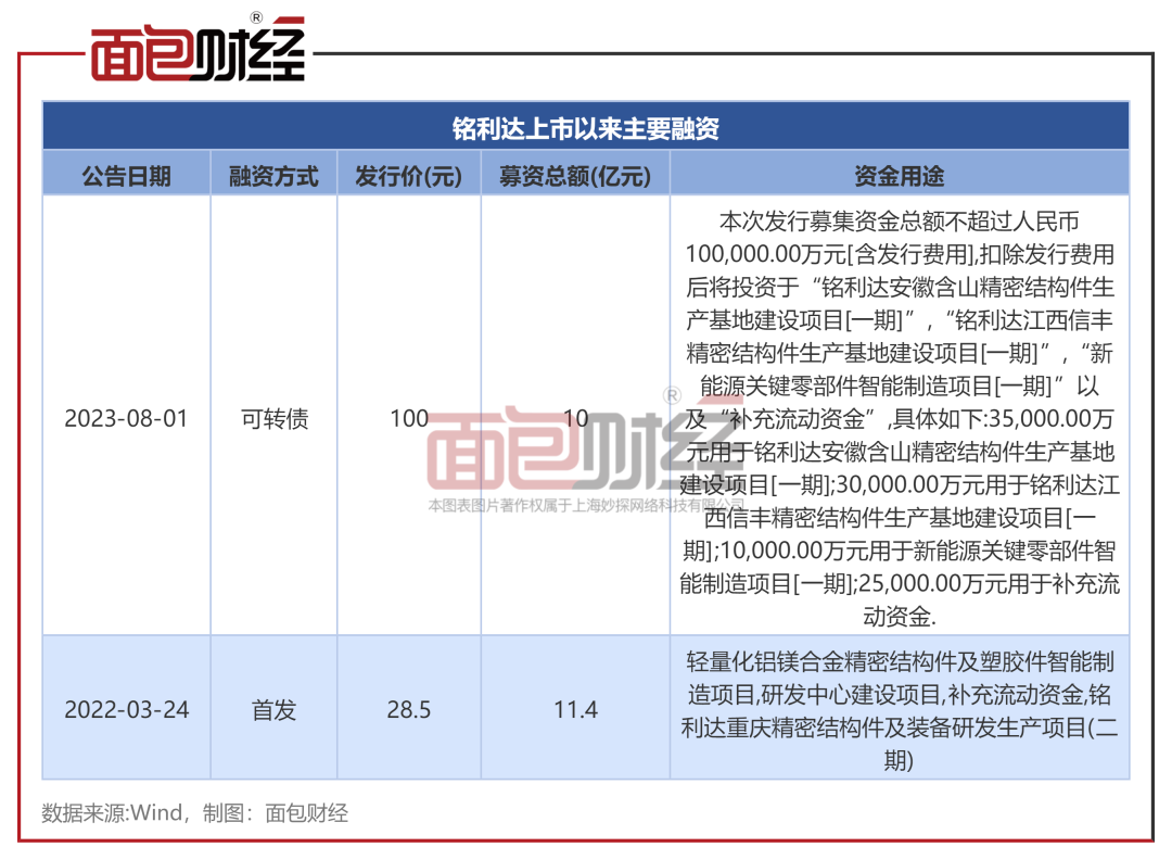 铭利达于2022年在创业板上市,首发募资11.4亿元。随后于2023年,公司通过发行可转债募资10亿元。