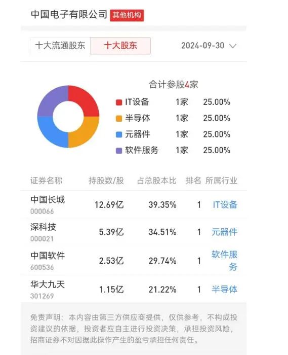 公开信息显示,目前中国电子有限公司参股的上市公司共有四家。除华大九天外,还有中国长城、深科技、中国软件。