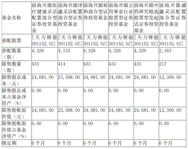 此外,前海开源医疗健康灵活配置混合型证券投资基金、前海开源泽鑫灵活配置混合型证券投资基金、前海开源裕和混合型证券投资基金、前海开源公用事业行业股票型证券投资基金、前海开源中药研究精选股票型发起式证券投资基金、前海开源盛鑫灵活配置混合型证券投资基金6只基金参加了新乡天力锂能股份有限公司(以下简称:天力锂能)首次公开发行股票网下申购。