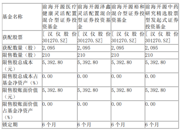 公告显示,前海开源基金所管理的前海开源医疗健康灵活配置混合型证券投资基金、前海开源泽鑫灵活配置混合型证券投资基金、前海开源裕和混合型证券投资基金和前海开源中药研究精选股票型发起式证券投资基金4只基金金参加了北京汉仪创新科技股份有限公司(以下简称:汉仪股份)首次公开发行股票网下申购。
