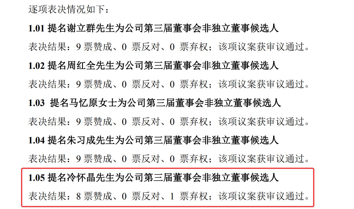 公告显示,在非独立董事候选人的提名表决中,谢立群、周红全、马忆原和朱习成均获9票赞成,全票通过;而冷怀晶的提名结果为8票赞成、1票弃权。