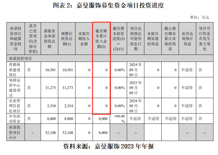 然而,在通过IPO募得资金后,除了补充流动资金项目如期投入外,嘉曼服饰其余三个募投项目投资进度均为0。