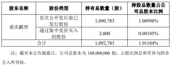 截至公告披露日,重庆麒厚持有公司股份1,092,783股(占公司总股本的1.01%),其中1,090,783股为首次公开发行前已发行股份,2,000股为集中竞价增持股份。