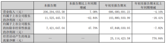 2024年前三季度,公司营业收入6.87亿元,同比减少4.16%;归属于上市公司股东的净利润1.04亿元,同比减少18.41%;归属于上市公司股东的扣除非经常性损益的净利润6784.80万元,同比减少7.82%;经营活动产生的现金流量净额2511.44万元,同比增长776.84%。