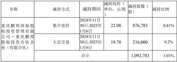 1月7日,公司披露《关于北京嘉曼服饰股份有限公司特定股东减持计划实施完成的公告》,公司于2024年11月26日披露公告,持股1.01%的股东重庆麒厚西海股权投资管理有限公司-重庆麒厚股权投资合伙企业(有限合伙)(简称“重庆麒厚”)计划自减持计划公告之日起3个交易日之后3个月内以集中竞价交易方式减持股份数量不超过公司股份总数的0.81%,大宗交易的方式减持公司股份数量不超过公司股份总数的0.2%。近日公司收到重庆麒厚告知函,重庆麒厚通过集中竞价交易方式累计减持公司股份876,783股,通过大宗交易方式累计减持公司股份216,000股,减持计划已实施完毕。