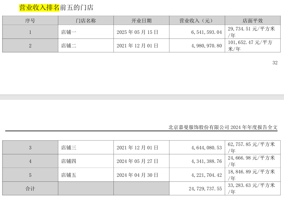 但是值得注意的是,这家营业收入最多的店铺的开业时间居然为2025年5月15日,而嘉曼服饰2024年年报的披露时间为2025年4月28日。其在2025年5月份开业的店铺,在2024年就已经形成收入,并成为了其众多店铺中收入最高的一家。对于投资者而言,这一重要的经营信息显然穿越了时空。