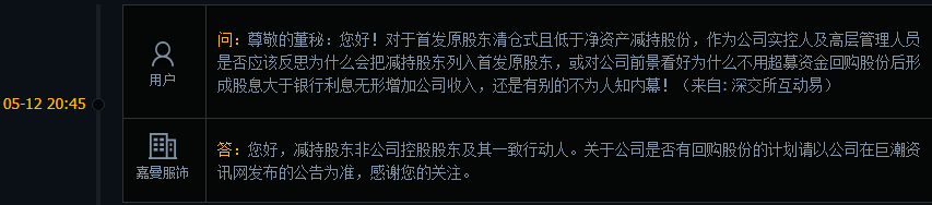 而这也引起投资者的疑问。每经资本眼专栏记者发现,投资者多次在互动易平台询问其回购股份维护公司股价的事宜,但截至目前,嘉曼服饰尚未发布过回购计划,也未发布过“质量回报双提升”行动方案、市值管理制度、股东回报规划、估值提升计划等方面的文件。