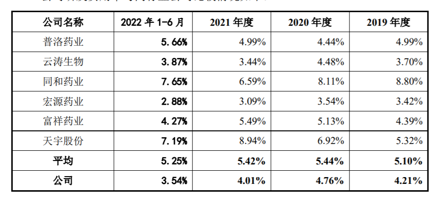 2019年-2021年及2022年上半年,新天地药业的研发投入分别为1712.36万元、2061.93万元、2058.92万元和1230.47 万元,占营业收入比例分别为4.21%、4.76%、4.01%和3.54%;研发费用率与同行业公司比较,低于可比公司平均水平。