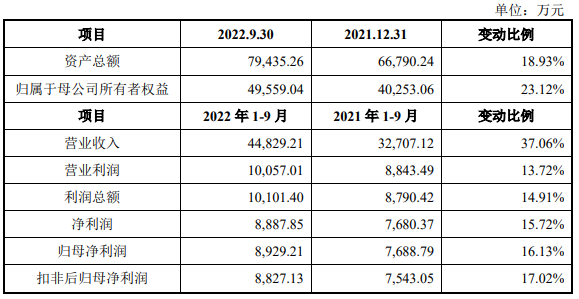 2022年1-9月,公司营业收入44,829.21万元,较上年同期增长37.06%;归母净利润为8,929.21万元,较上年同期增长16.13%;扣非后归母净利润为8,827.13万元,较上年同期增长17.02%。