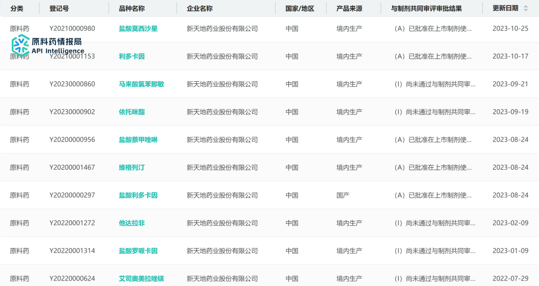 目前新天地药业原料药登记已达10个品种,其中5个A状态的品种分别为:盐酸莫西沙星、利多卡因、利多卡因、维格列汀、盐酸利多卡因。5个I状态原料药分别为:马来酸氯苯那敏、依托咪酯、他达拉非、盐酸罗哌卡因、艾司奥美拉唑镁。