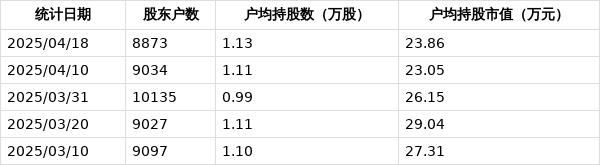 从4月22日公开信息显示,金道科技截至2025年4月18日公司股东户数为8873户,较上期(2025年4月10日)减少161户,降幅为1.78%,变化不大。