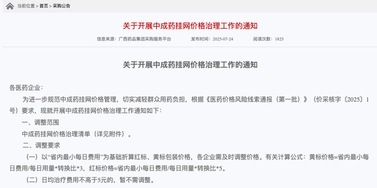 据悉,《医药价格风险线索通报(第一批)》于7月9日发布。该文件显示,经初步测算,当前全国挂网的8.8万余种中成药中,有个别中成药在部分省份的日均治疗费用是该省同种药品最低日均治疗费用的5倍以上,要求各省(区、市)引导相关企业主动规范价格行为,调整至合理价格水平或依本地区挂网规则采取相应措施。