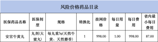 如安宫牛黄丸(每丸重3g(天然牛黄、天然麝香))在宁夏挂网价为998元/丸,按每日用量1丸计算,日治疗费用达998元,是省内最小每日费用的10倍以上。在宁夏曝光的54个中成药中,日费用超最低价10倍以上的不在少数。