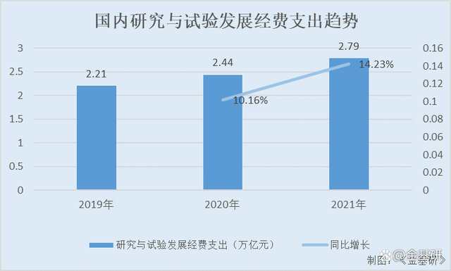 2021年,国内研究与试验发展经费支出增长表现强劲。2019-2021年国内研究与试验发展经费支出从2.21万亿元增长到2.79万亿元,2021年同比增长14.23%;研发经费支出投入强度(研究与试验发展经费支出/国内生产总值)为2.44%,同比增长2%。根据“十四五”规划,国内全社会研发经费投入年均增长7%以上。未来,国内研究与试验发展经费支出的快速和持续增长,有利于PCB样板市场规模持续扩大。