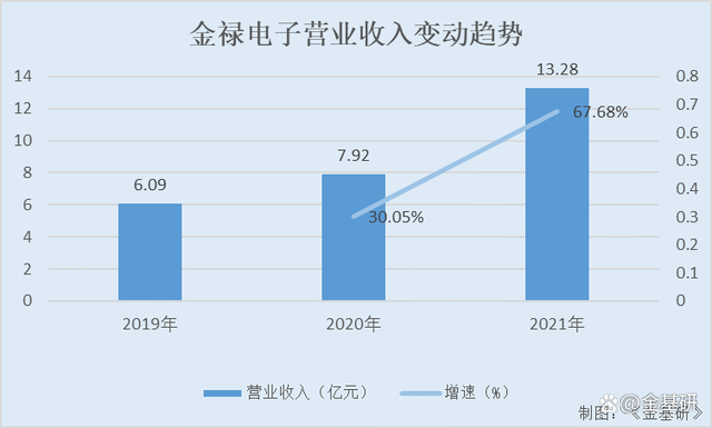 2019-2021年,金禄电子的营业收入分别为6.09亿元、7.92亿元、13.28亿元,2020-2021年增速分别为30.05%、67.68%。