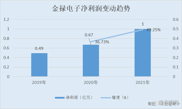 同期,金禄电子的净利润分别为0.49亿元、0.67亿元、1亿元,2020-2021年增速分别为36.73%、49.25%。