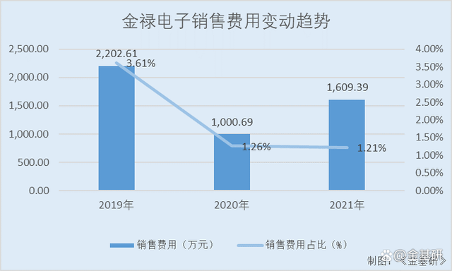 同期,金禄电子销售费用分别为2,202.61万元、1,000.69万元、1,609.39万元,占营业收入比例分别为3.61%、1.26%、1.21%。
