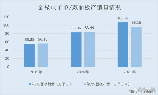 2019-2021年,金禄电子的单/双面板的产量分别为56.13万平方米、83.49万平方米、96.16万平方米,销售数量分别为55.35万平方米、83.06万平方米、106.97万平方米。