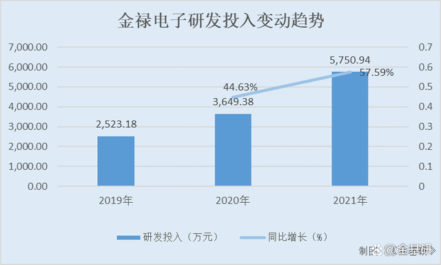 2019-2021年,金禄电子的研发投入分别为2,523.18万元、3,649.38万元、5,750.94万元,2020-2021年分别同比增长为44.63%、57.59%。