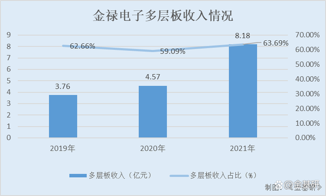 同期,金禄电子来自多层板的收入分别为3.76亿元、4.57亿元、8.18亿元,占当期主营业务收入的比例分别为62.66%、59.09%、63.69%。