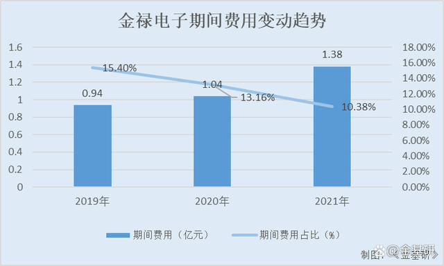 2019-2021年,金禄电子期间费用分别为0.94亿元、1.04亿元、1.38亿元,占营业收入比例分别为15.4%、13.16%、10.38%。