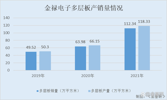 2019-2021年,金禄电子的多层板的产量分别为50.3万平方米、66.15万平方米、118.33万平方米,销售数量分别为49.52万平方米、63.98万平方米、112.34万平方米。