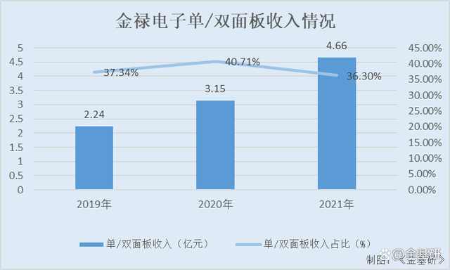 其中,2019-2021年,金禄电子来自单/双面板的收入分别为2.24亿元、3.15亿元、4.66亿元,占当期主营业务收入的比例分别为37.34%、40.71%、36.3%。