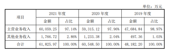 鸿日达成立于2003年,专业从事精密连接器的研发、生产及销售,深耕精密电子连接器制造领域多年,产品主要应用于手机及周边产品、可穿戴设备、电脑等消费电子行业。报告期内,公司主营业务收入分别为47,684.84万元、59,315.12万元和60,059.25万元,占当期营业收入的比例分别为98.97%、97.96%和97.14%,主营业务突出。公司主营业务收入主要来源于连接器和精密机构件产品,2019年至2021年,公司主营业务收入的复合增长率为12.23%,整体呈增长趋势。