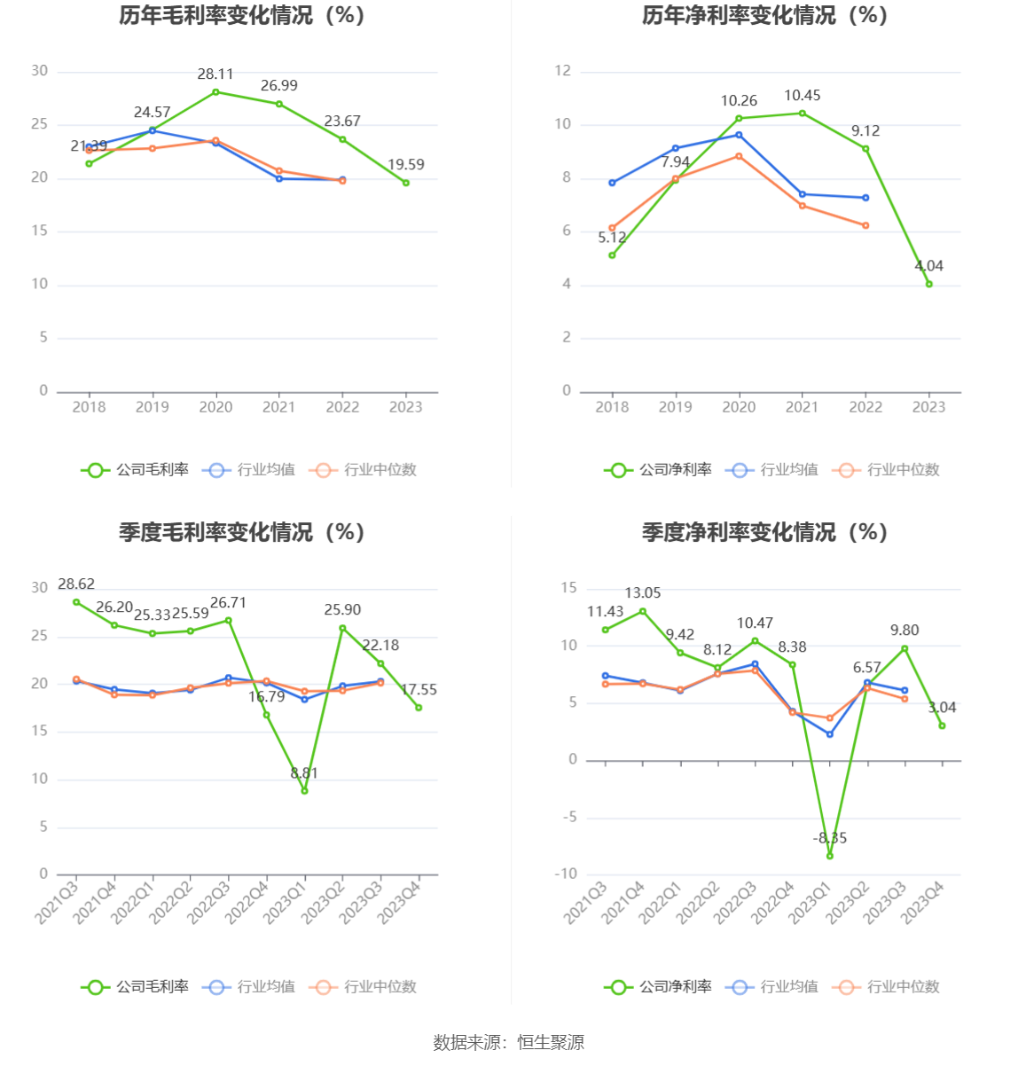 2023年,公司毛利率为19.59%,同比下降4.08个百分点;净利率为4.04%,较上年同期下降5.08个百分点。从单季度指标来看,2023年第四季度公司毛利率为17.55%,同比上升0.76个百分点,环比下降4.63个百分点;净利率为3.04%,较上年同期下降5.34个百分点,较上一季度下降6.76个百分点。