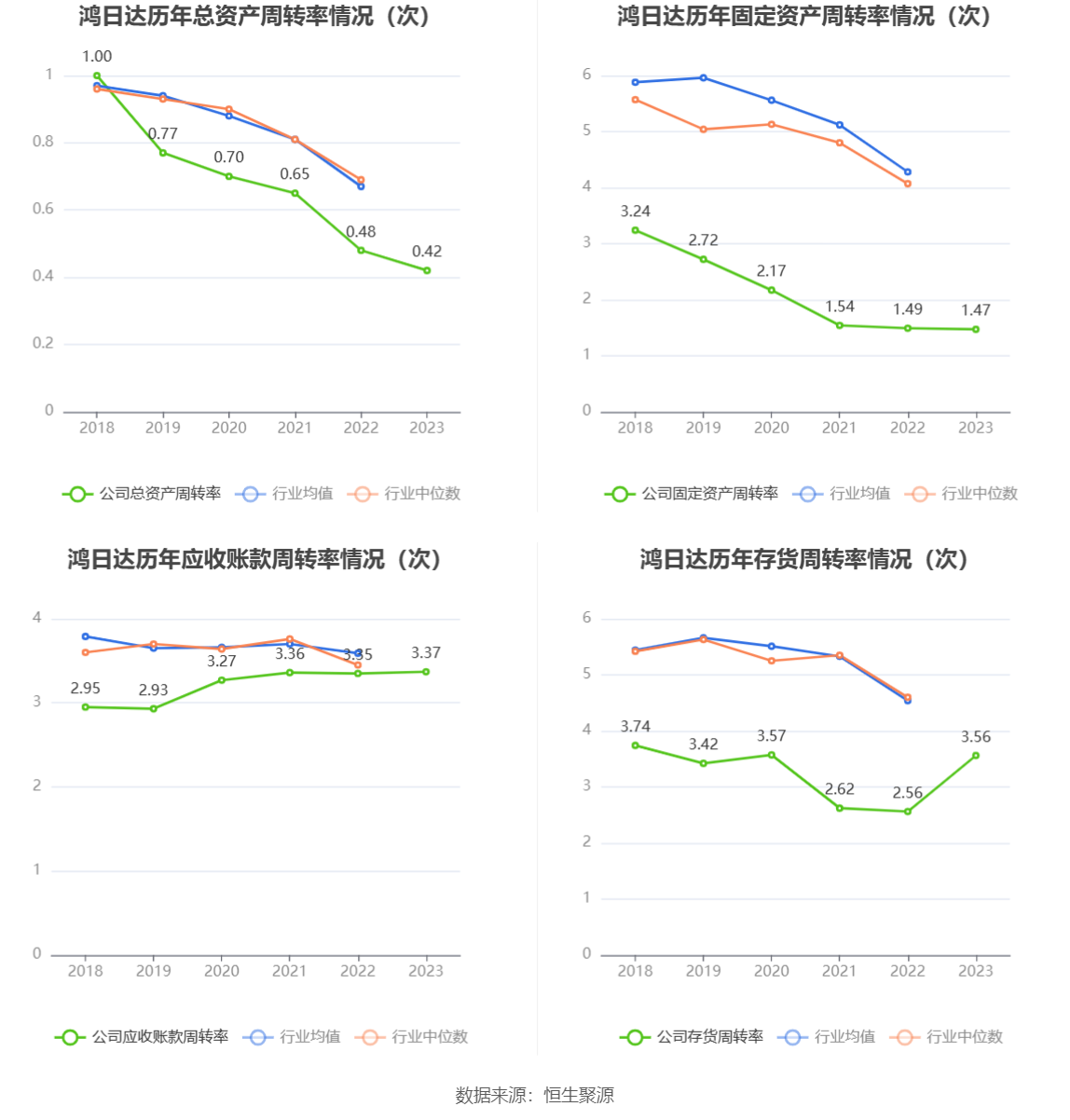 营运能力方面,2023年,公司公司总资产周转率为0.42次,上年同期为0.48次(2022年行业平均值为0.67次,公司位居同行业77/94);固定资产周转率为1.47次,上年同期为1.49次(2022年行业平均值为4.28次,公司位居同行业84/94);公司应收账款周转率、存货周转率分别为3.37次、3.56次。