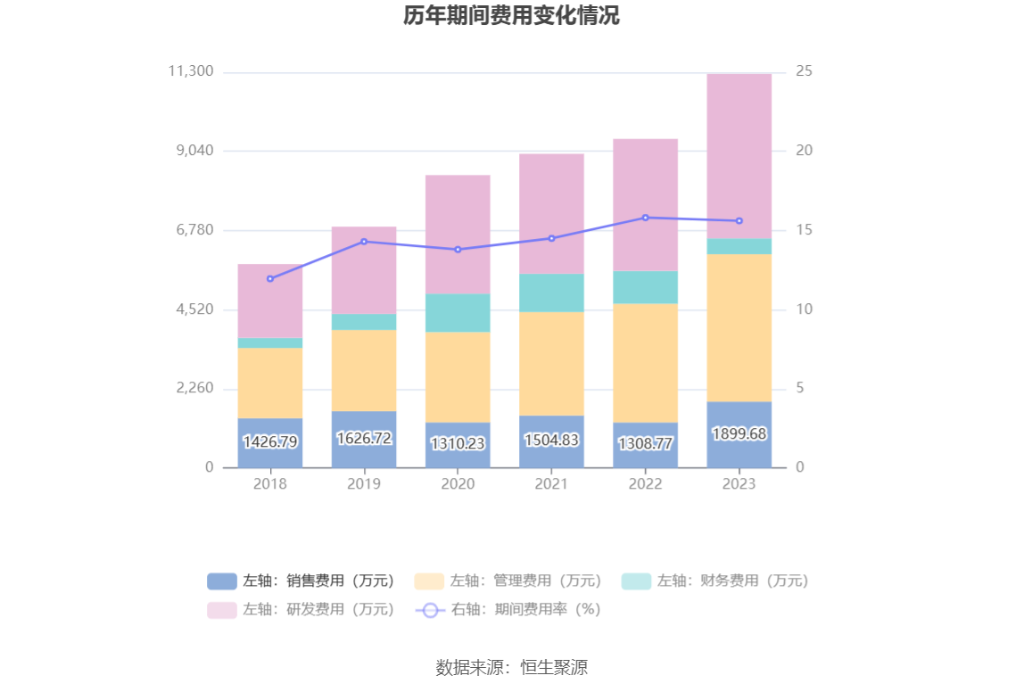 2023年,公司期间费用为1.13亿元,较上年同期增加1855.03万元;但期间费用率为15.62%,较上年同期下降0.20个百分点。其中,销售费用同比增长45.15%,管理费用同比增长24.32%,研发费用同比增长24.63%,财务费用同比下降51.84%。