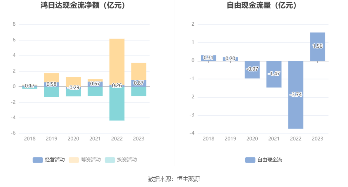 进一步统计发现,2023年公司自由现金流为1.56亿元,上年同期为-3.74亿元。