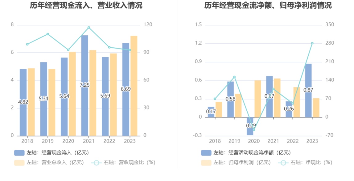 2023年,公司营业收入现金比为92.81%,净现比为280.90%。