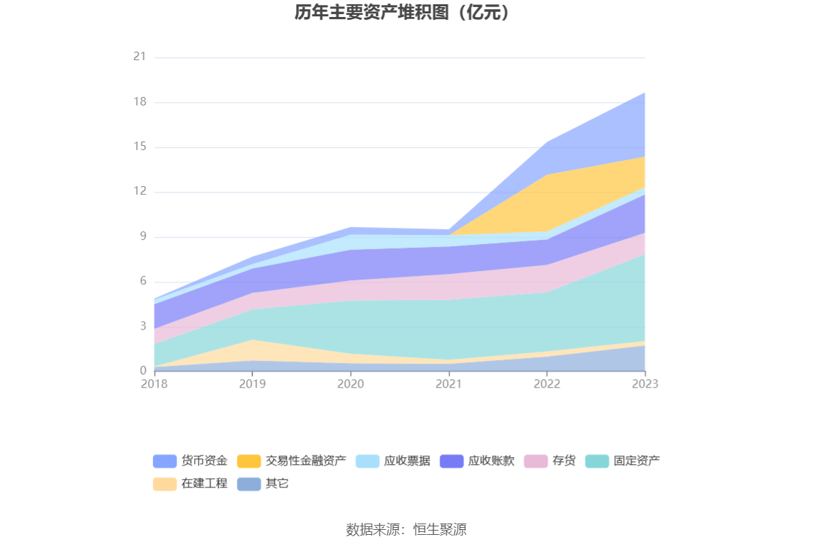 资产重大变化方面,截至2023年年末,公司交易性金融资产较上年末减少46.51%,占公司总资产比重下降13.88个百分点;货币资金较上年末增加97.48%,占公司总资产比重上升8.84个百分点;固定资产较上年末增加46.91%,占公司总资产比重上升5.33个百分点;存货较上年末减少21.62%,占公司总资产比重下降4.23个百分点。