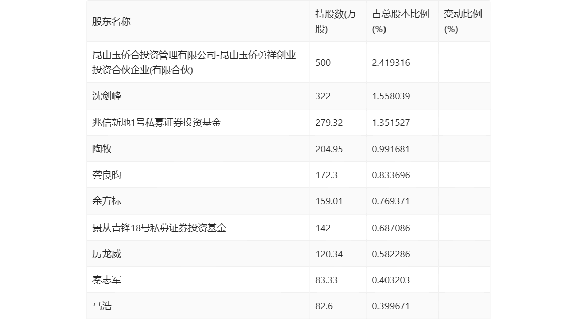 年报显示,2023年年末公司十大流通股东中,新进股东为昆山玉侨合投资管理有限公司-昆山玉侨勇祥创业投资合伙企业(有限合伙)、景从青锋18号私募证券投资基金、厉龙威、马浩,取代了三季度末的平安证券股份有限公司、光大证券股份有限公司、华泰证券股份有限公司、J.P.Morgan Securities PLC-自有资金。在具体持股比例上,兆信新地1号私募证券投资基金持股有所上升,沈剑峰、陶牧、龚良昀、余方标、秦志军持股有所下降。