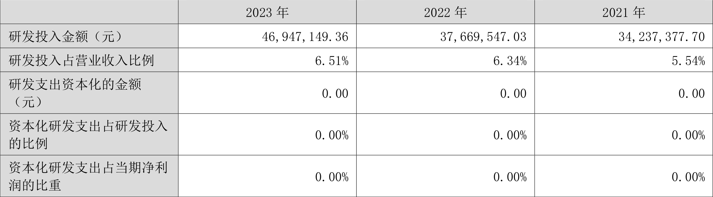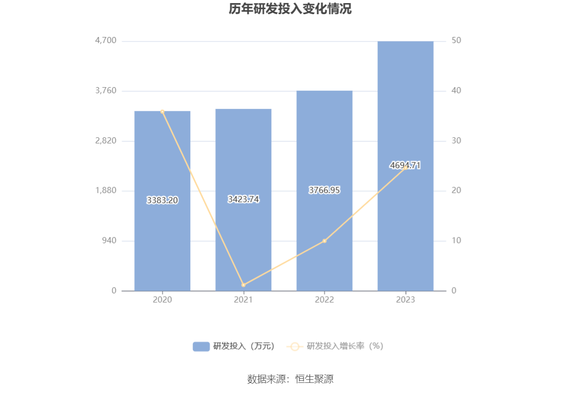 2023年全年,公司研发投入金额为4694.71万元,同比增长24.63%;研发投入占营业收入比例为6.51%,相比上年同期上升0.17个百分点。此外,公司全年研发投入资本化率为0。
