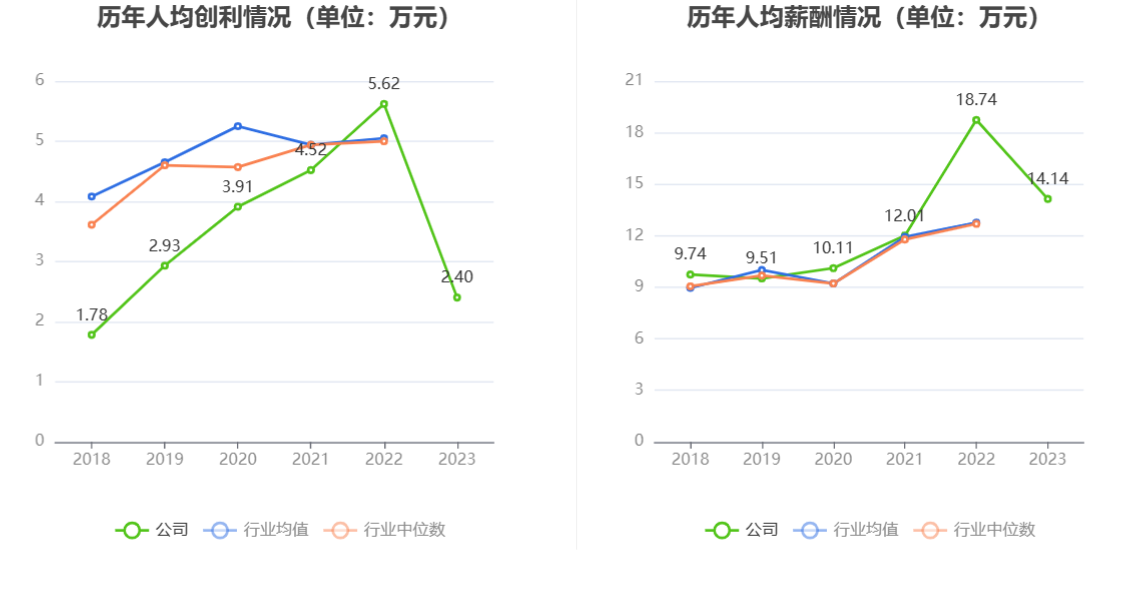 截至2023年末,公司员工总数为1291人,人均创收55.82万元,人均创利2.40万元,人均薪酬14.14万元,较上年同期分别下降17.66%、57.24%、24.54%。