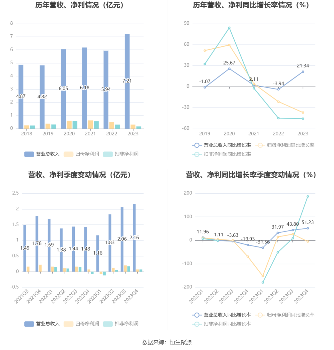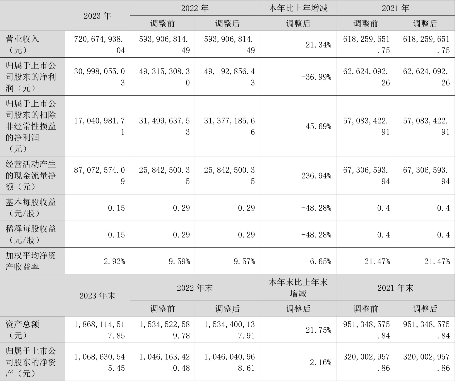 鸿日达(301285)4月24日披露2023年年报。2023年,公司实现营业总收入7.21亿元,同比增长21.34%;归母净利润3099.81万元,同比下降36.99%;扣非净利润1704.10万元,同比下降45.69%;经营活动产生的现金流量净额为8707.26万元,同比增长236.94%;报告期内,鸿日达基本每股收益为0.15元,加权平均净资产收益率为2.92%。公司2023年年度利润分配预案为:拟向全体股东每10股派0.93元(含税)。