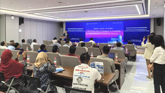 2023年10月27日,2023年应对气候变化南南合作“绿色低碳发展与可再生能源应用”培训班在一带一路环境技术交流与转移中心(深圳)开展培训交流活动。来自老挝、柬埔寨、印度尼西亚、塞舌尔、津巴布韦等12个国家的26名应对气候变化领域的政府官员、专家学者、技术人员参加了本次培训。清研环境科技股份有限公司总经理助理余必懂代表公司出席了本次培训,向培训学员们介绍了公司在污水处理领域的服务方式及创新成果。