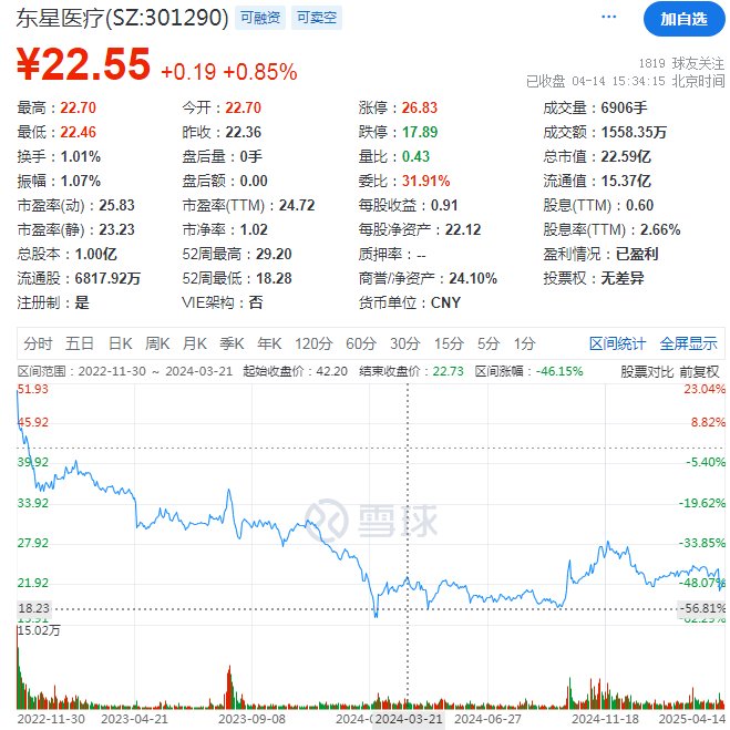 二级市场上,东星医疗最新报价22.55元/股,总市值22.59亿元,上市以来,该股已跌超四成。