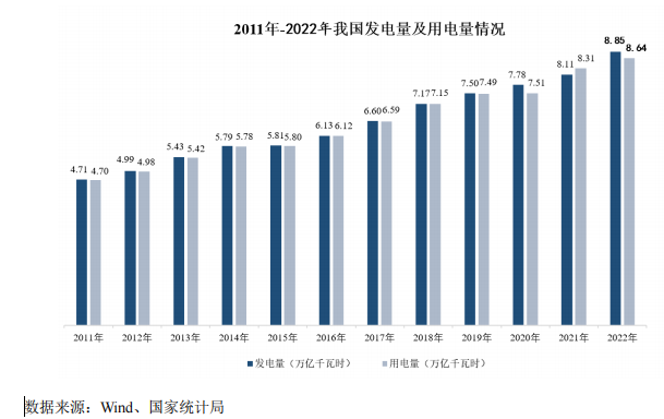 2022 年,全国全口径发电量为 8.85 万亿千瓦时,同比增长 9.11%,全社会用电量 8.64 万亿千瓦时,同比增长 3.94%。2011 年至 2022 年我国全社会发电量与用电量情况如下图所示: