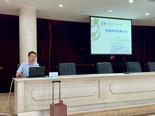 在健康帮扶活动中,三博脑科神经外科三病区主任刘方军、神经外科三病区科研副主任雷霆分别带来专题培训。刘方军以《颈动脉狭窄的早期诊断、治疗及术后防治》为题,结合临床案例系统讲解了颈动脉疾病的全程管理策略,强调早期干预对降低脑卒中风险的重要性。