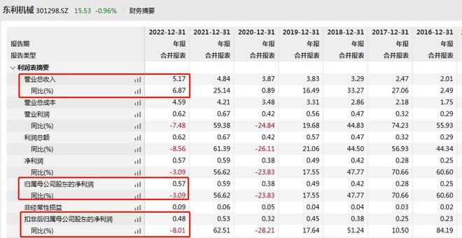 财务数据显示,上市当年,东利机械营增利减。具体来看,2022年,公司实现营业收入5.17亿元,同比增加6.87%;净利润0.57亿元,同比回落3.09%。