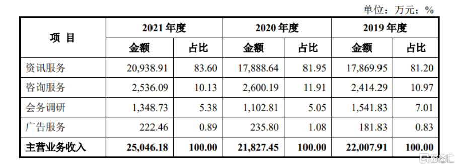 报告期内,卓创资讯的主营业务收入主要来源于资讯服务、咨询服务和会务调研服务,三者合计占主营业务收入的比例在98%以上。
