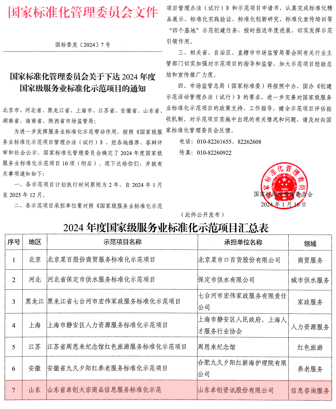 2024年1月10日,国家标准化管理委员会公布2024年度国家级服务业标准化示范项目名单,由淄博市市场监管局、张店区市场监管局共同组织培育的“山东省卓创大宗商品信息服务标准化示范项目”在全国34个省、直辖市、自治区推荐项目中脱颖而出,成功立项国家级标准化示范项目,成为大宗商品信息服务行业首家获此殊荣的企业。