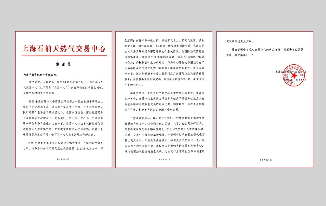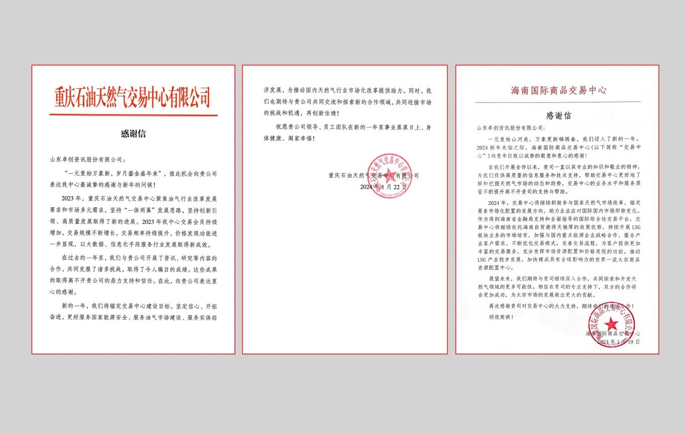 1月中下旬,上海石油天然气交易中心、重庆石油天然气交易中心、海南国际商品交易中心向山东卓创资讯股份有限公司发来感谢信,就卓创资讯过去一年给予的支持和帮助表示感谢。