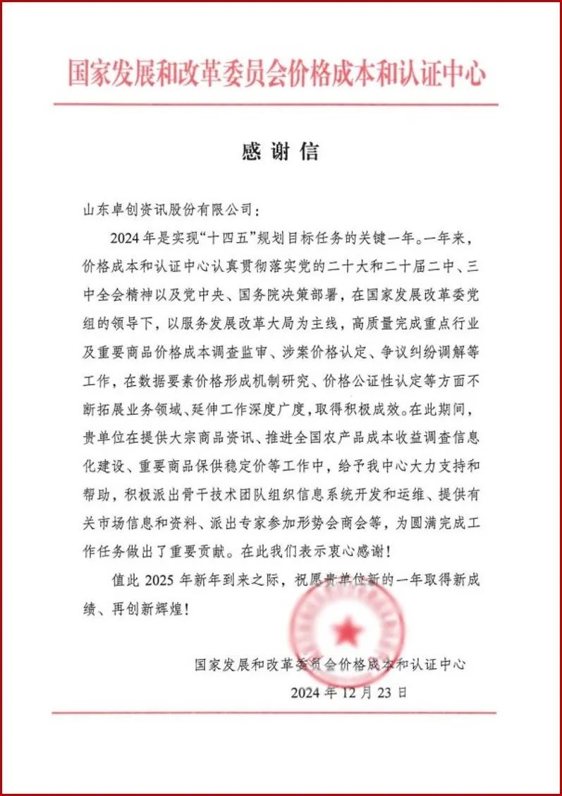 信中,国家发展和改革委员会价格成本和认证中心对卓创资讯在提供大宗商品资讯、推进全国农产品成本收益调查信息化建设、重要商品保供稳定价等工作中给予的支持和协助表示感谢。