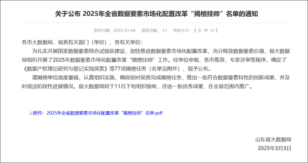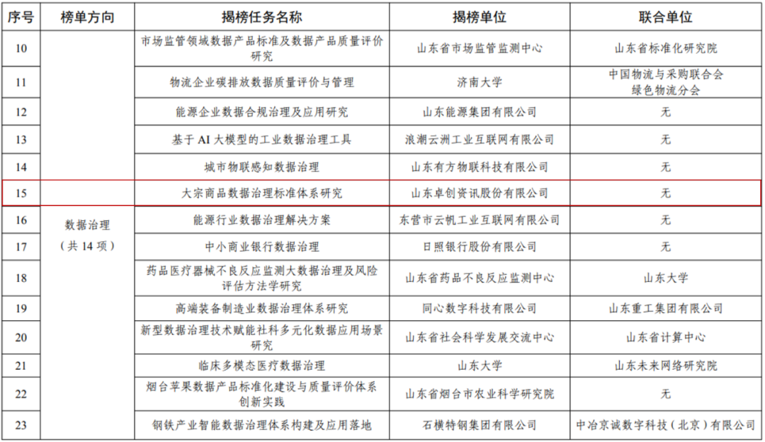 3月3日,山东省大数据局正式揭晓2025年全省数据要素市场化配置改革“揭榜挂帅”榜单。经各市推荐、专家评审,山东卓创资讯股份有限公司